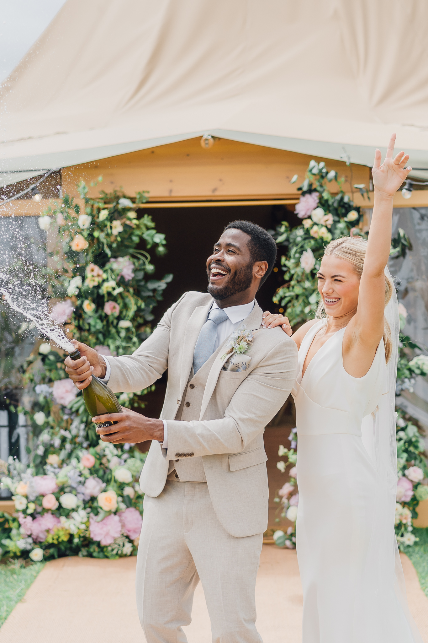 I had an image in my mind of an outdoor summer wedding with a fun, relaxed vibe and lots of flowers in soft pastel shades. I wanted it to demonstrate how fresh flowers can transform a space and make it feel personal and unique to each couple. The final colour palette consisted of shades of pastel pink, lilac, blue, peach, and yellow, which were reflected in the flowers, favours and cake. I chose pale blue for the table linen, candles, groom’s tie and bouquet ribbons for a cohesive look.